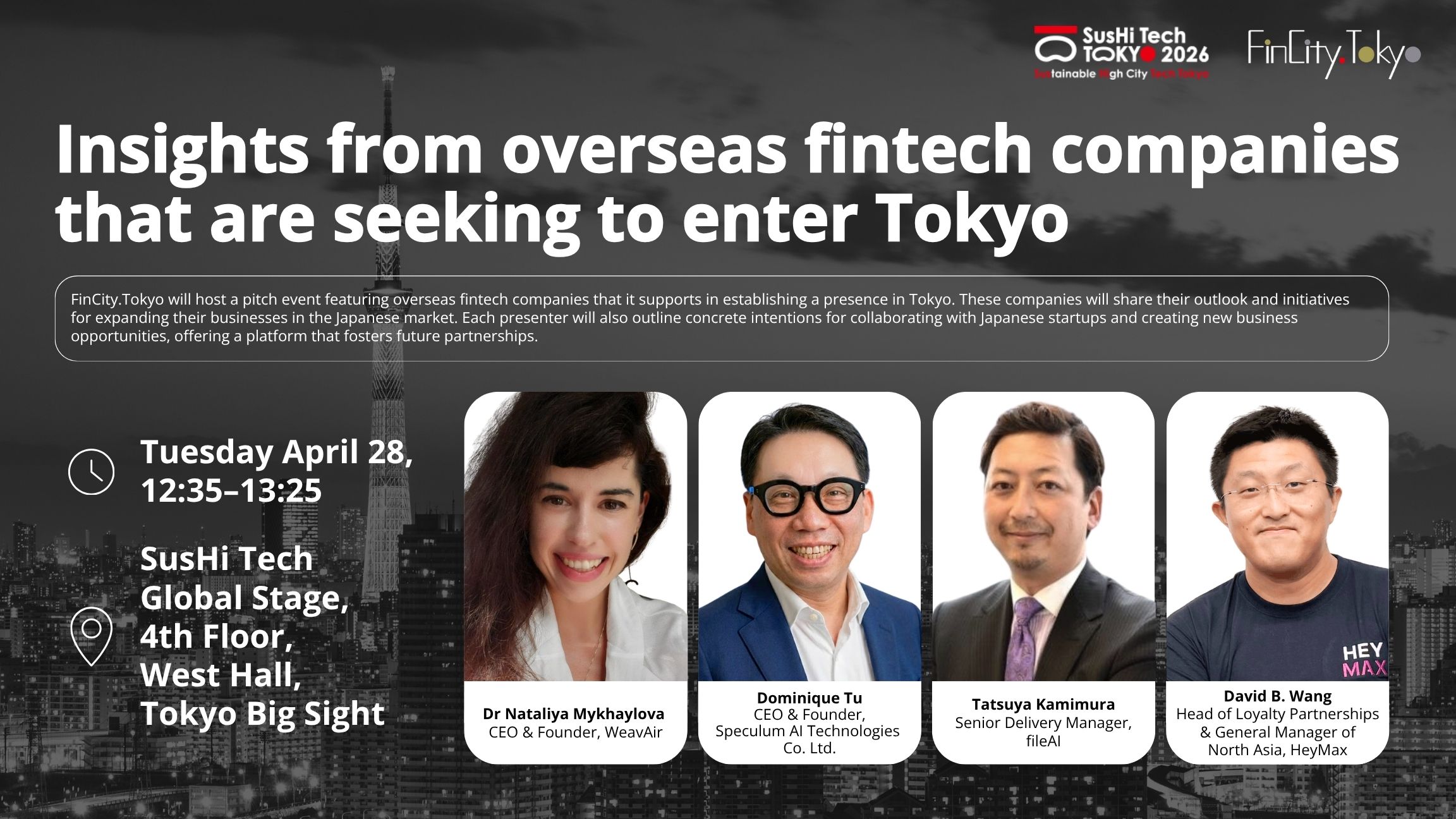 FinCity.Tokyoが東京拠点の設立を支援している海外フィンテック企業が登壇し、日本市場での事業展開の展望や取組を紹介するピッチイベントを開催します。各社が日本のスタートアップ(SU)等との協業やビジネス機会の創出に向けた具体的な意向を発信し、新たな連携につながる機会を提供します。