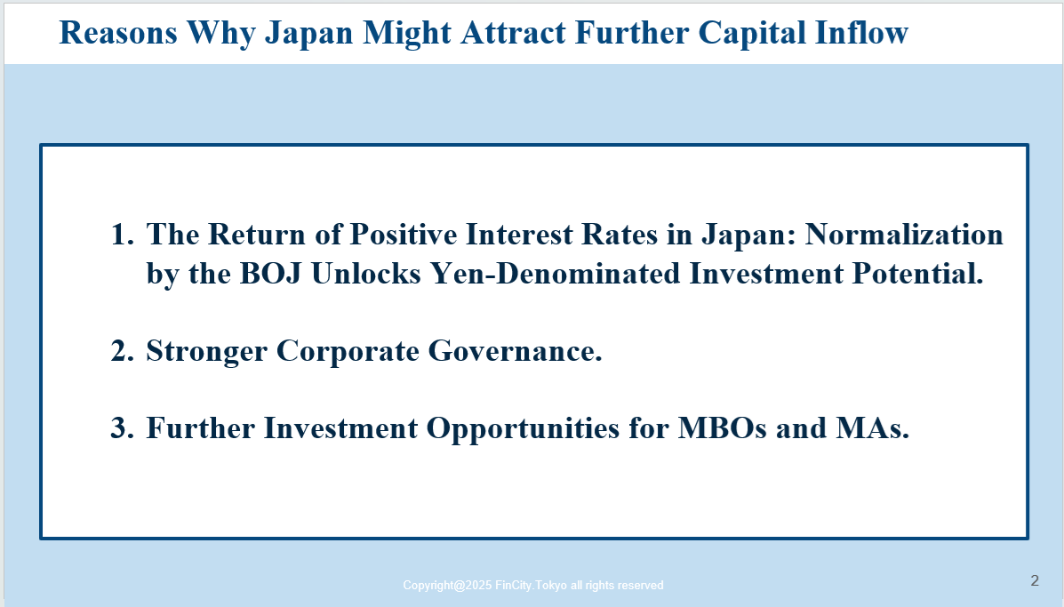 To summarize into three words: Japan is back. After the painful lessons of the Lost Decades, we have a robust banking system, deflation is behind us, and global investors are enthusiastic. Amidst the global uncertainty arising from Trump 2.0 policies, Japan’s economy has demonstrated its resilience and capital keeps flowing into our country. I see this trend continuing for several reasons (also outlined in Chart 1):