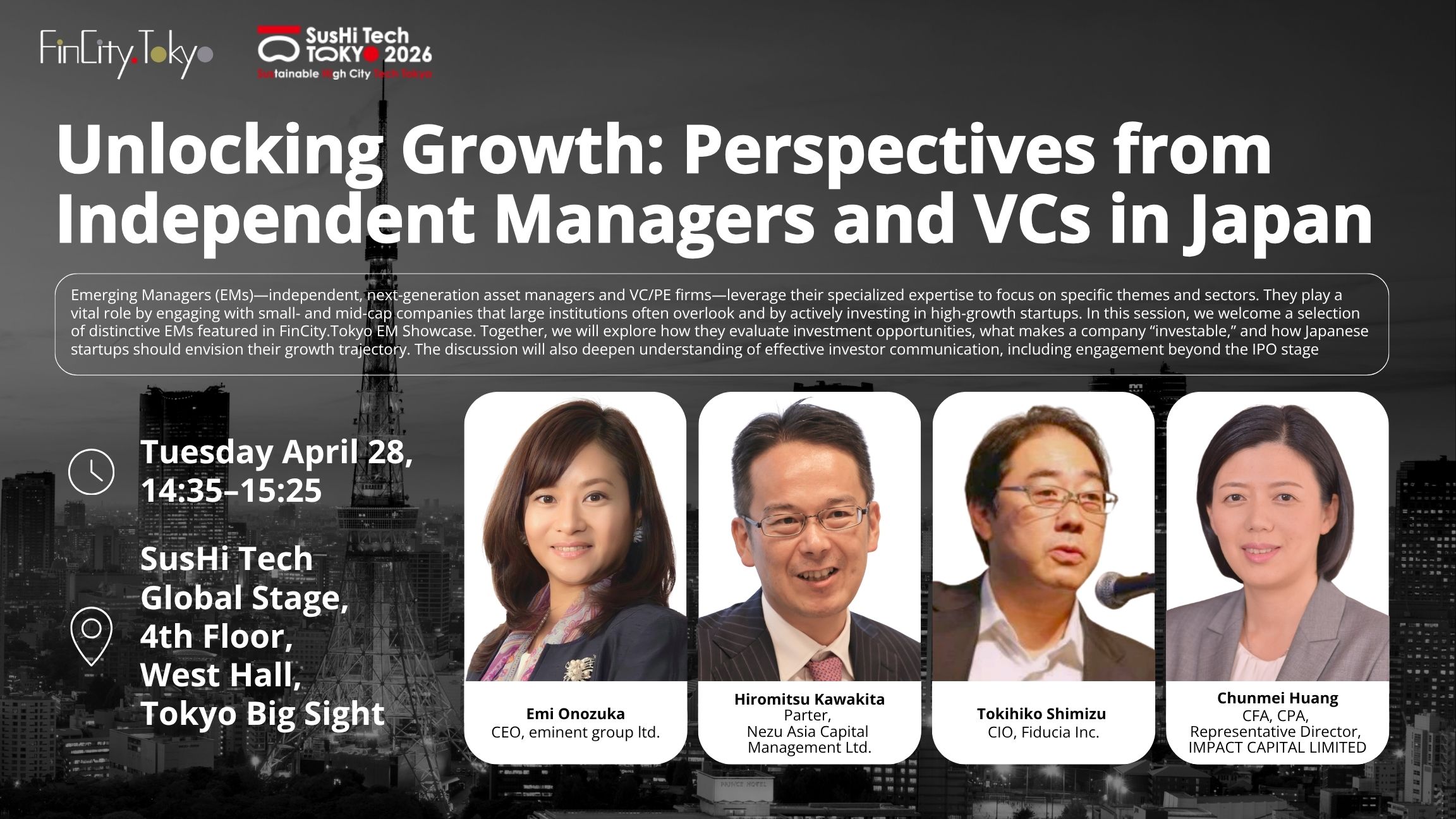In this session, we welcome a selection of distinctive EMs featured in the FinCity.Tokyo EM Showcase. Together, we will explore how they evaluate investment opportunities, what makes a company “investable,” and how Japanese startups should envision their growth trajectory. The discussion will also deepen understanding of effective investor communication, including engagement beyond the IPO stage.