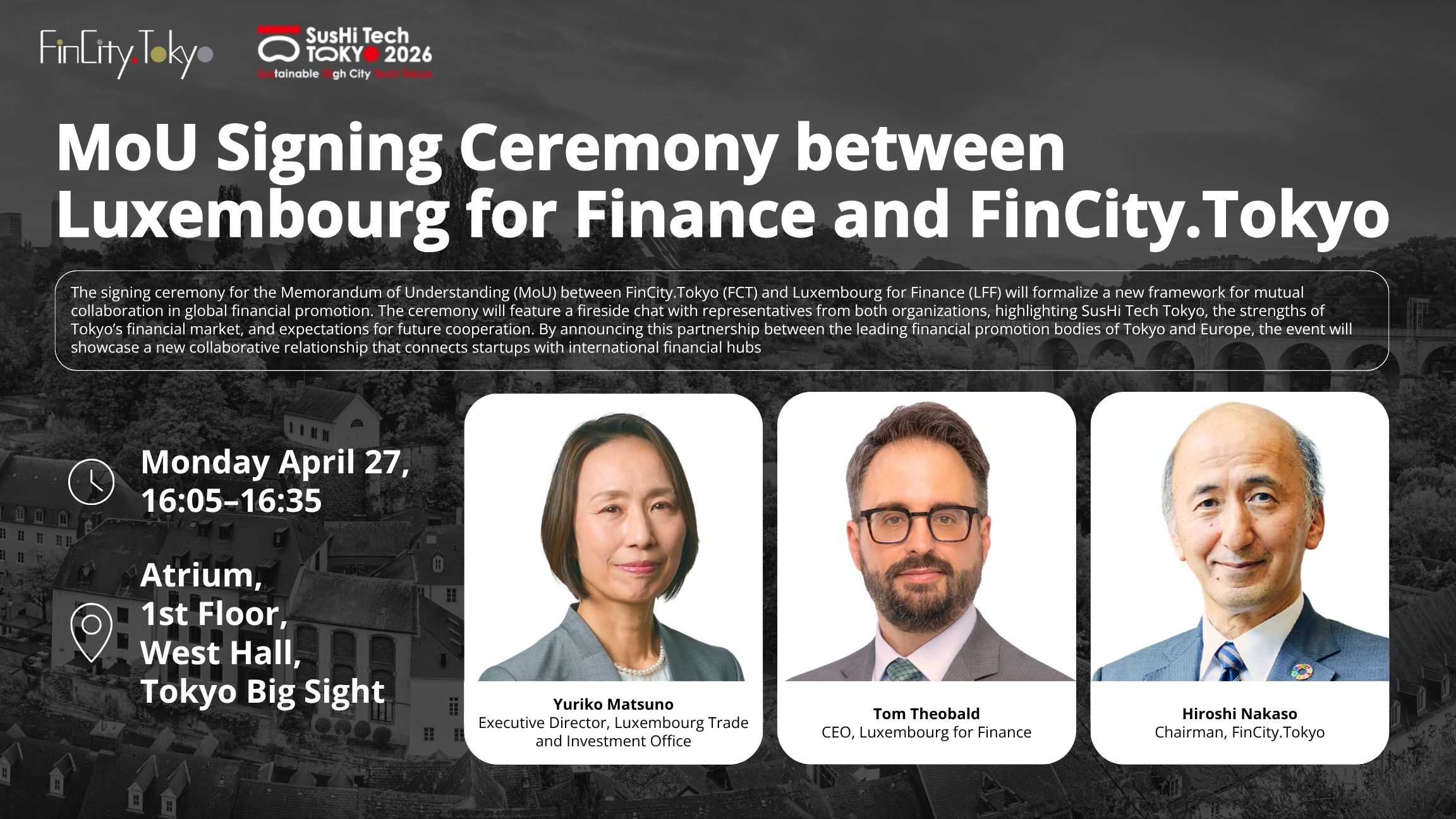 The signing ceremony for the Memorandum of Understanding (MoU) between FinCity.Tokyo (FCT) and Luxembourg for Finance (LFF) will formalize a new framework for mutual collaboration in global financial promotion. The ceremony will feature a fireside chat with representatives from both organizations, highlighting SusHi Tech Tokyo, the strengths of Tokyo’s financial market, and expectations for future cooperation. By announcing this partnership between the leading financial promotion bodies of Tokyo and Europe, the event will showcase a new collaborative relationship that connects startups with international financial hubs.