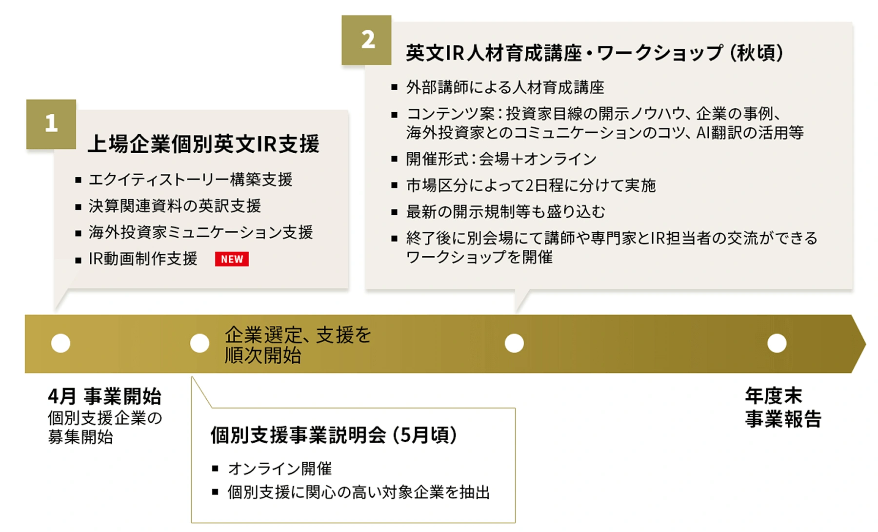 本事業においては、新興市場において時価総額が比較的小さい企業のIR活動に対し、事業活動の持続可能性等を訴求するエクイティ・ストーリーの構築支援、決算関連開示資料等の作成アドバイス及びその英訳支援、海外投資家とのコミュニケーションアドバイスなどのIR支援を実施します。
