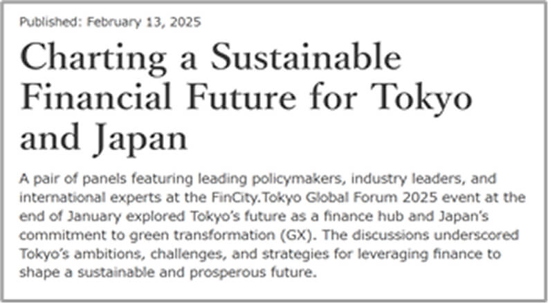 Tokyo Sustainable Finance Week(TSFW)は、FinCity.Tokyoが主催する年次のイベントウィークです。国内外の金融機関や有識者が集う国際フォーラム「Tokyo Sustainable Finance Forum」などが開催されます。